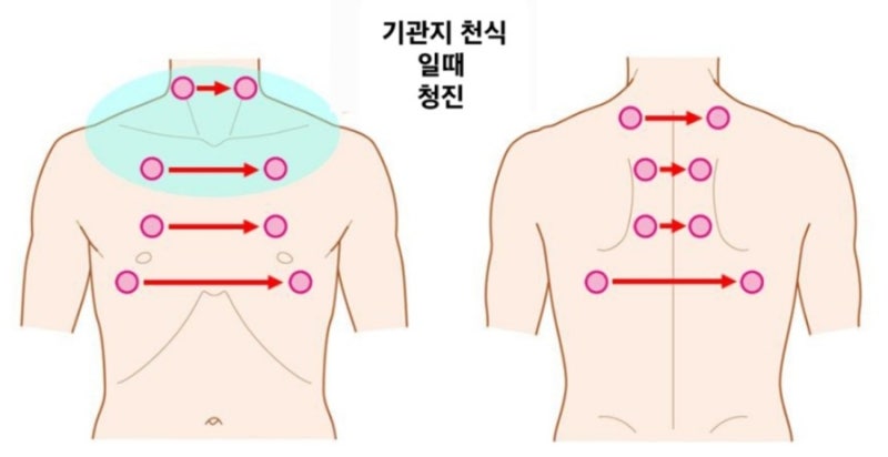 기관지 천식을 일으키는 환자는 흡기 또는 호기 중에 휘파람이 들립니다 . 특히 청진기를 맞춰야 할 위치는 그림 1 입니다.
